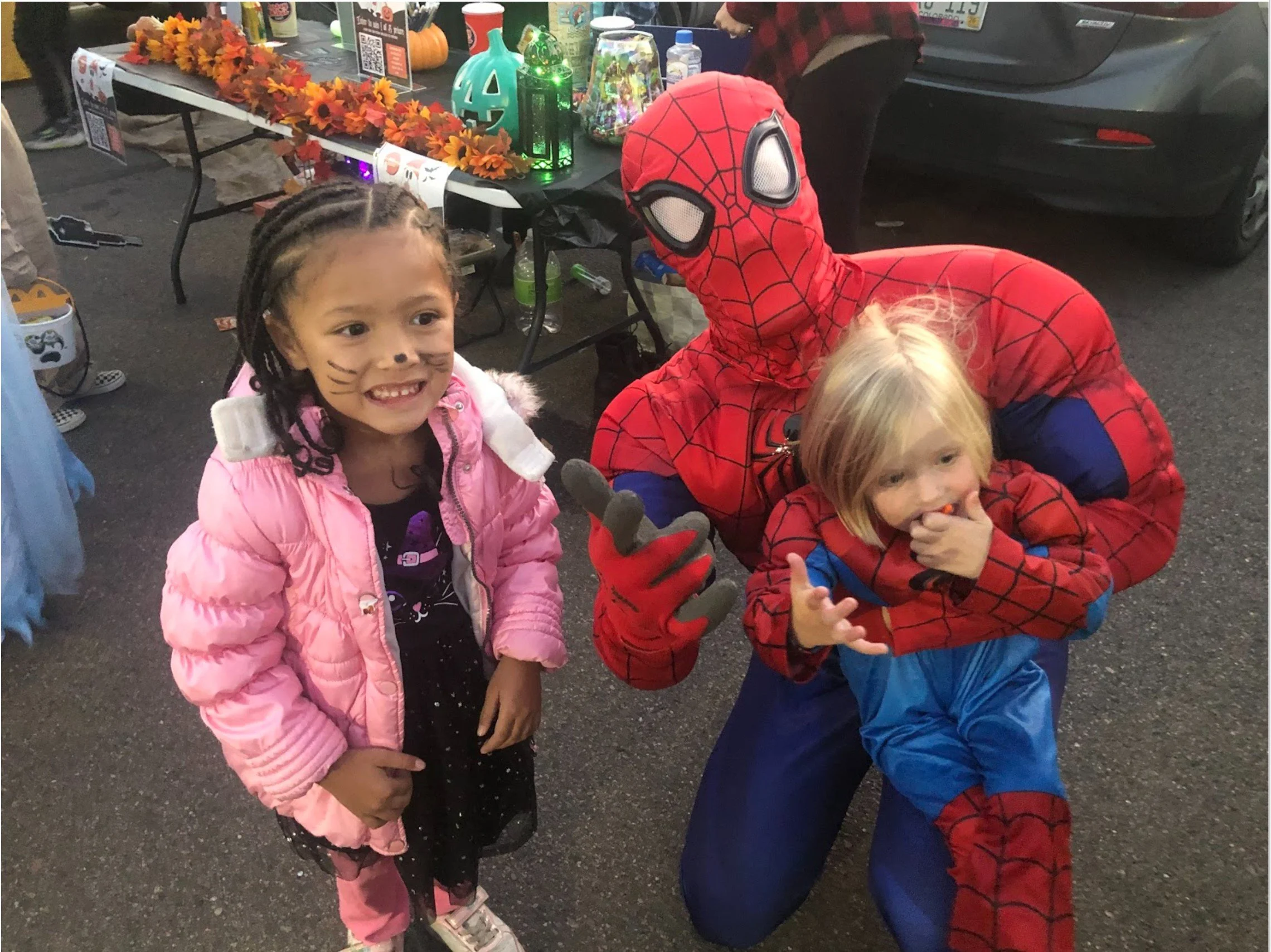 The highlight of the event was the superheroes, especially thanks to Buzzy Bee, who brought Thatman, Blade, Spider-Man, and Deadpool to life. Thatman even rode around in his iconic vehicle, allowing kids to tour the car and capture memorable moments with him. The event was filled with a diverse array of costumes, including both fun and scary options, as well as family-themed costumes. The kids couldn’t resist indulging in the candy and laughter that filled the air. The trunk or treat was a delightful addition to the overall enjoyable experience.