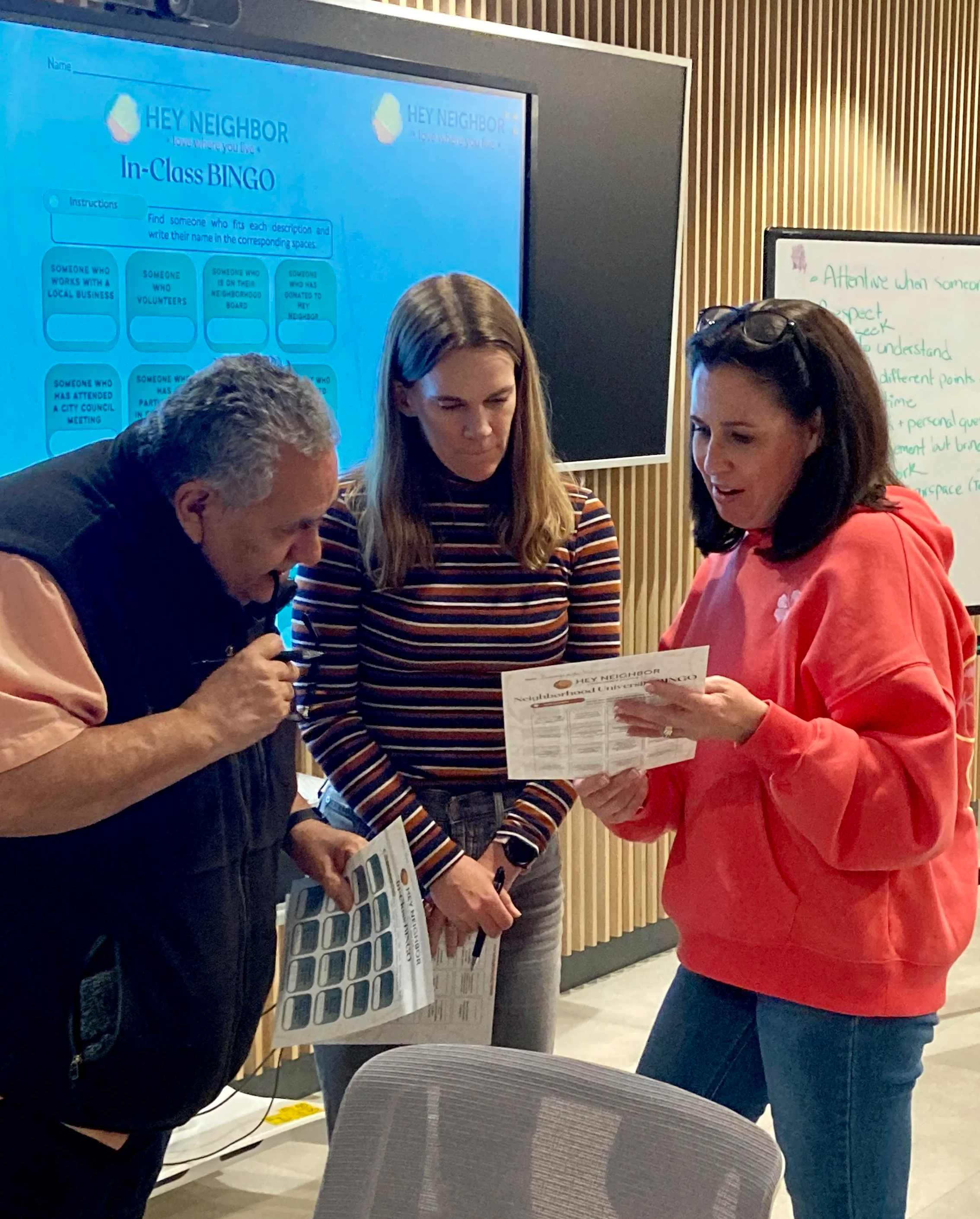 A highlight of the evening was a visit from Hey Neighbor’s three Community Coordinators, who stopped by to introduce themselves and welcome the new cohort. Each coordinator shared inspiring examples of neighbor led action from across the city. From small gatherings to larger community projects, their stories showed how everyday residents are already making a real impact in their neighborhoods.